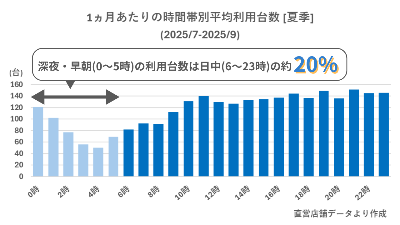 次のグラフは夏季における時間帯別の利用台数を表しています。直営店舗のデータでは、深夜・早朝(0~5時)の利用台数は日中の利用台数の約20%となりました。つまりこの例においては、24時間体制で営業することで夜間休業の場合に比べ、1.2倍のユーザーを獲得しています。