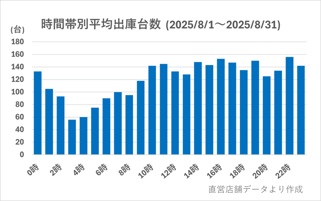 下図は直営店舗の今年8月における時間帯別平均出庫台数を示しています。一般的なセルフ洗車場において、夏季は日中の気温の高さや直射日光による熱中症リスクの影響から、陽が落ちて気温が落ち着いた夕方から深夜にかけて利用が集中する傾向にあります。