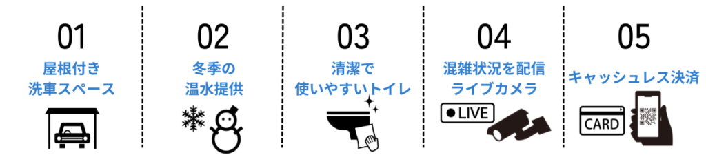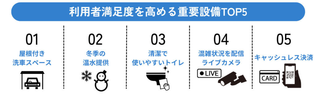 ここからは、弊社の専門家がおすすめする、利用者満足度向上に直結する人気設備を5つご紹介します。特に「混雑状況を配信するライブカメラ」「キャッシュレス決済」は、洗車前後の顧客行動まで考慮した設備となっており、よりよい顧客体験の提供に貢献します。