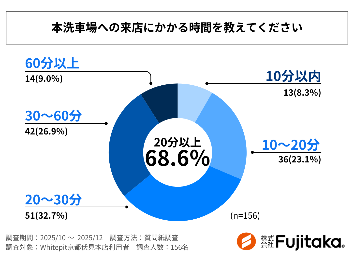 回答より、洗車場へ20分以上かけて来店される遠方のお客様が68.6%とおよそ7割を占める結果となりました。また、なかには高速道路を利用して来店されている熱心なお客様も散見され、Whitepitが非常に遠方のユーザーを掴んでいることがわかりました。